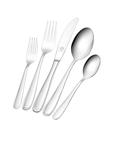 Servizio di posate da 72 pezzi, composto da: 12 coltelli, 12 forchette, 12 cucchiai, 12 forchettine, 12 cucchiaini, 2 cucchiai da portata, 2 coltelli da carne, cucchiaio e forchetta da insalata, cucchiaio e pinza per zucchero, paletta per torte, cucchiaio da crema, mestolo per salsa, mestolo da zuppa. Spessore da 3,5 mm. Valigetta in ecopelle inclusa.